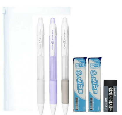 수능샤프 3입과 샤프심 2개, 지우개, 파우치까지 함께 구성된 수능샤프 시험전용 세트입니다. 뒤 샤프심이 받쳐 주어서 샤프심을 끝까지 남김없이 사용할 수 있는 기능이 장점입니다. 이 모든 세트를 파우치에 담아 사용할 수 있으니 휴대하기에도 좋고 편리합니다.