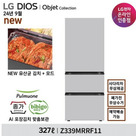 327L의 LG 디오스 오브제 김치냉장고는 24년 9월 새로 출시된 제품입니다. 인공지능 맞춤보관으로 3단계 냉기케어 시스템과 유산균김치 모드가 추가되었습니다. 유산균김치 모드는 류코노스톡 유산균을 최대 57배 더 많아지게 해 줍니다.