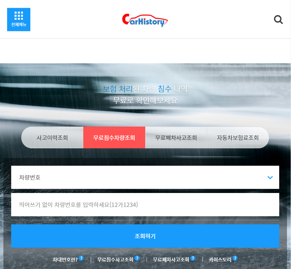 카히스토리 홈페이지에 접속하시면 화면 중간의 두 번째 '무료침수차량조회' 메뉴가 보이실 겁니다. 이 메뉴를 클릭해주세요. 그런 다음, 차량번호 입력 후 조회하기 버튼을 눌러주시면 침수사고 여부와 침수일 등등 침수사고내역을 확인하실 수 있습니다.
